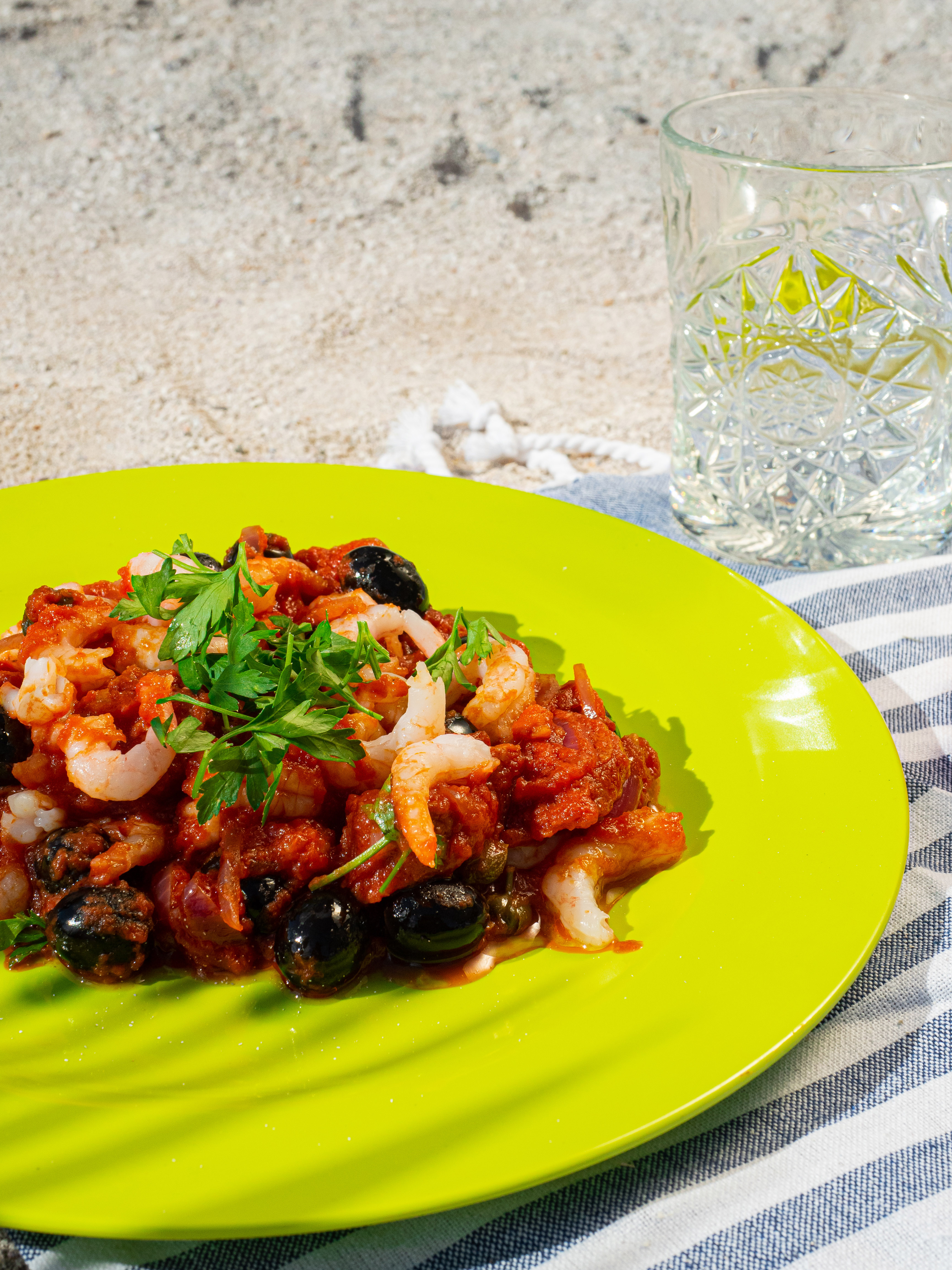 2. Kok pastaen etter anvisningen på pakken og vend den inn i sausen, ha i rekene.