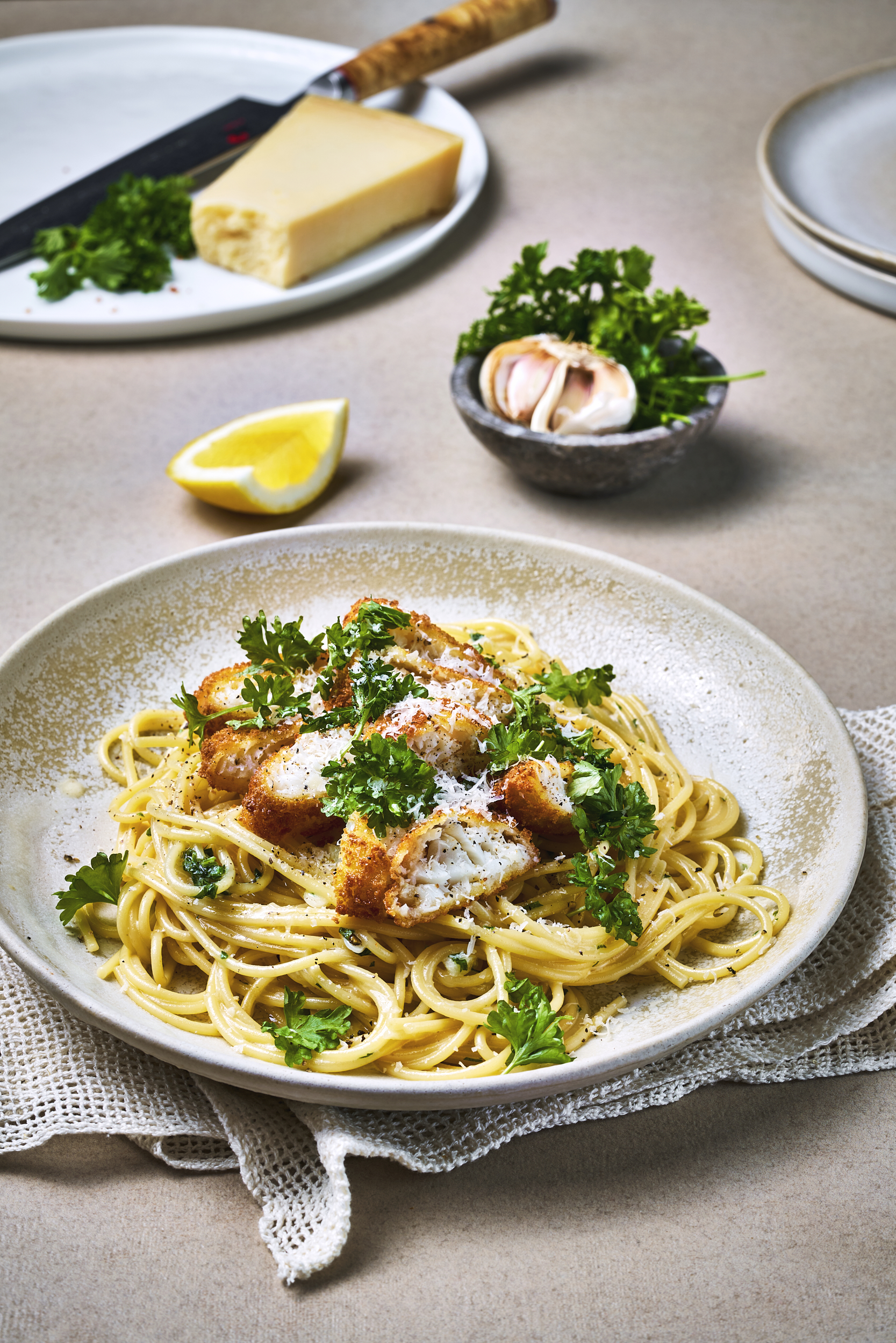 - Server med Sprø Torsk og topp med pinjekjerner.