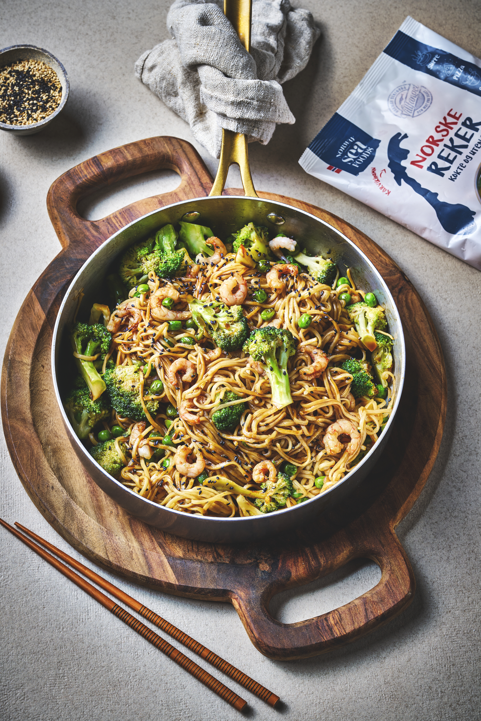 – To pakker med reker for under hundrelappen er helt fin pris for en middag. Nudlene koster 15 kroner. Det er ikke særlig over 150 kroner når man regner med grønnsakene også, sier hun.